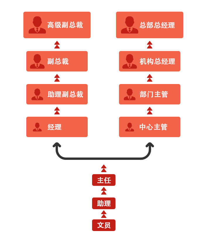 公司为员工在公司的成长与发展设计了专业职级和行政管理两个序列,其中专业序列涵盖14个职级,行政序列涵盖8个职级。员工可以根据自身优势和意愿选择职业发展道路,通过营造绩效辅导的文化,总分公司人力资源部门与各层级主管将帮助员工在职业发展中提升岗位需要的专业及管理能力。另外,通过总分和机构之间的轮岗计划, 提升并拓展了员工的专业能力和发展空间。