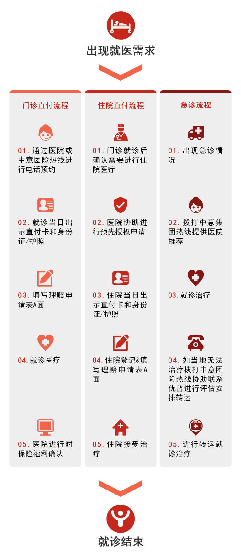 高端医疗产品依托欧美等发达国家医疗体系,就诊流程与国内有较大区别,如就诊预约制,住院需要申请预授权,转诊责任制等。中意人寿以客户便利为优先,制定如下建议流程图供您参考。